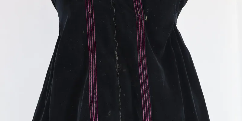 Kersetka made of black velvet. Fitted silhouette at the back, widened at the front. The back is split, widened from the waist downward with nine pleats ('mustaches'). Slanted shoulder seams. Fastened with the right panel using hooks. The right panel, neckline, and armholes are decorated with black velvet braid with a raspberry edge, and the hem with black lace. The kersetka is adorned at the hem and right panel with black machine stitching. The right panel is decorated with buttons. The kersetka is lined with brown factory-produced cotton fabric. Cords for waist cinching are sewn into the side seams at the waistline.