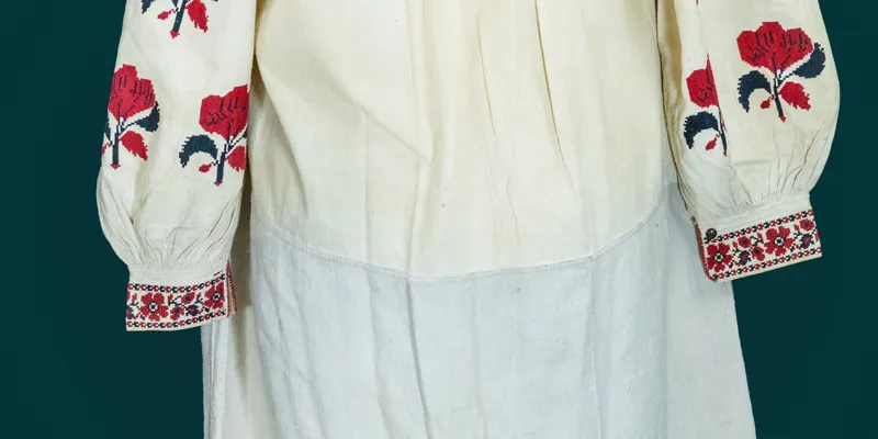 Shirt with a straight silhouette, 'to the hem.' The body and hem are sewn from five panels (body from two 'odynadtsiatka,' hem from three 'desiatka'). The sleeve is straight with a gusset and an insert, sewn along the base, gathered at the bottom into small pleats using the 'sewing to the collar' technique, on a cuff stitched at the top and bottom with double 'stem stitch,' fastened with a buttonhole and a small plastic button, decorated at the top with 'puff stitches' (6 cm long). The sleeve and insert on the back side are sewn with a double 'stem stitch.' The body and inserts are gathered at the neckline into small pleats using the 'sewing to the collar' technique. The neckline is round with a 24 cm slit in the center front, finished with a narrow band with a single 'stem stitch' at the edges and a broken line between them. The band has buttonholes on both sides. The shirt is decorated with a black and red floral ornament. The insert has a horizontal stripe of eight-petaled flowers with branches and leaves (1.7 cm wide), framed on both sides by a narrow stripe of stylized floral ornament (0.5 cm wide). The upper edge of the sleeve (aligned with the 'puff stitches') has a 0.5 cm wide stripe of the same stylized ornament. The sleeve features a scattered pattern of stylized tulips with stems and leaves. The cuff is decorated with a stripe of five-petaled flowers with branches and leaves, framed by a stylized 'chain' (3.5 cm wide). The cuff side edges are decorated with red threads. The hem is hemmed with a 'single bar,' above which is a 1.5 cm wide openwork stripe with semi-triangles and diagonal lines. Between them is a 0.5 cm wide white-on-white embroidery stripe that echoes the openwork motifs. The connecting seams of the body are decorated at the bottom with blue and red threads (6 cm long). Legend: The shirt was made by Mohlot Varvara Mykhailivna and belonged to her and her daughter Tymchenko S.V., who lived in Kharkiv in 1968 at Hamarnyka Street, 7/9, apt. 5.