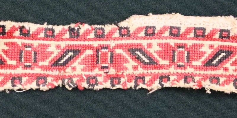 White rectangular canvas, folded in half, with embroidery. The ornament is floral-geometric, embroidered with 'cross-stitch.' The composition consists of stylized lilies separated by parallelograms placed on their narrower edge, with the sides of the parallelograms extending to form a wavy line, in the recesses of which flowers are inscribed. The composition is framed on both sides with the 'sosnivka' decorative stitch. Along the longer edges is a row of embroidery with alternating small squares and slanted lines. The embroidery is done with black and red zari thread.
