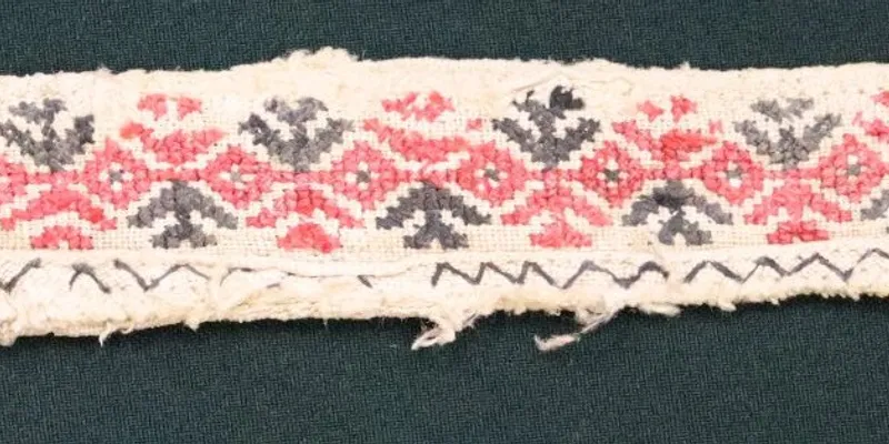 White rectangular canvas, folded in half, with embroidery. The ornament is stylized floral-geometric and geometric. The composition consists of a chain of small diamonds with a cross in the center, alternating with stylized two-colored shrubs. The lower part is decorated with the 'kryvulka' stitch. The edges are sewn with 'vystih.' The embroidery is done with black and red zari thread.