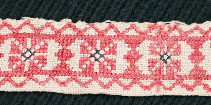 White rectangular canvas with embroidery. The ornament is stylized floral-geometric and geometric. The composition consists of a row of stylized four-petal flowers with petals in the shape of diamonds, alternating with a diamond to which triangles are attached at two corners—the 'wedges' motif. The composition is framed on both sides with a row of 'sosnivka' decorative embroidery and the 'nabyruvannya' stitch. The embroidery is done with red and black zari thread.