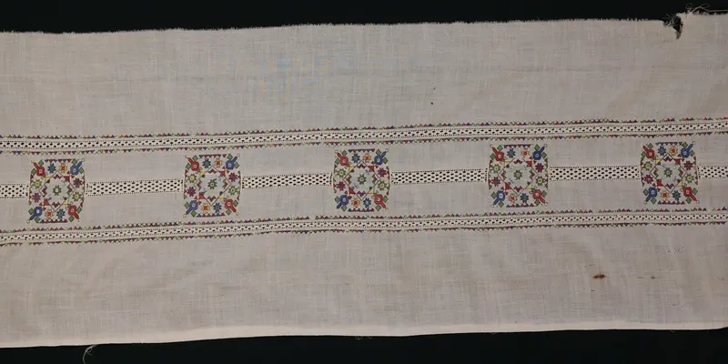 White rectangular fabric with embroidery. Floral and geometric ornaments executed in blue, yellow, green, red, and black floss threads and white cotton threads. The embroidery composition consists of three bands of openwork with rhombic holes—two identical narrow bands, edged with colored 'snails,' frame the central openwork band, interrupted by five 'medallions' filled with multicolored flowers and 'snails.'