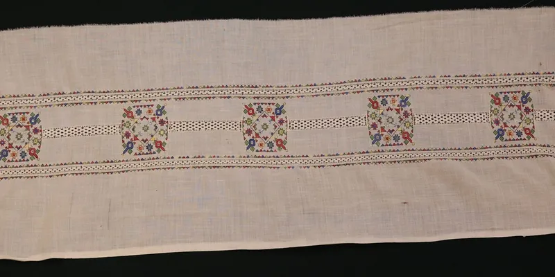White rectangular fabric with embroidery. Floral and geometric ornaments executed in blue, yellow, green, red, and black floss threads and white cotton threads. The embroidery composition consists of three bands of openwork with rhombic holes—two identical narrow bands, edged with colored 'snails,' frame the central openwork band, interrupted by five 'medallions' filled with multicolored flowers and 'snails.'