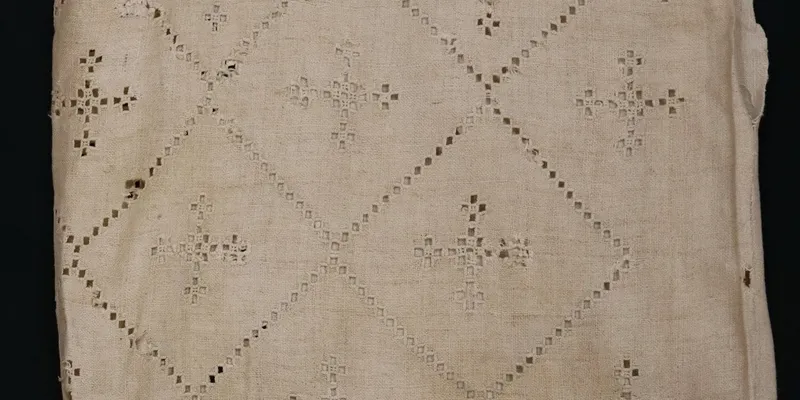 Embroidery on a women's shirt sleeve, made from homespun canvas. Translucent 'white-on-white' embroidery with a geometric ornament: the shoulder area is decorated with a wide horizontal band of ornament with inscribed rhombs and cross-shaped figures, while the sleeve field is embroidered with a rhombic grid with inscribed crosses.