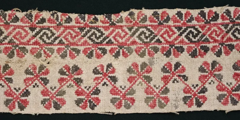 Embroidery on a fragment of homespun canvas, executed in black and red threads using the 'cross-stitch' technique. The pattern consists of two ornamental bands of a floral-geometric nature: a zigzag line with a six-petal flower at the corners and dots in the recesses, and a band of Ukrainian meander, bordered above and below by rows of half-flowers.