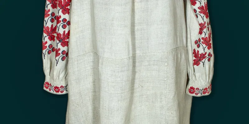 Shirt with a straight silhouette, 'to the hem.' The hem is sewn from three panels, the body from one, folded crosswise. The sleeve is straight with a gusset and an insert, sewn along the warp, decorated at the top with five rows of 'puff stitches,' 19 cm long, and connected to the insert with 'horodky' openwork stitching. At the bottom, it is gathered into small pleats and finished with a 3.5 cm wide cuff, fastened with two buttonholes and buttons. The body and inserts are gathered at the neckline using the 'sewing to the collar' technique. The neckline is square with a 29 cm slit in the center front, finished with a narrow hem. The shirt is adorned with a stylized floral ornament, embroidered with black and red cotton thread in a cross-stitch pattern (insert, sleeve, cuff) and openwork with a geometric pattern embroidered with hemp threads (hem). The insert and cuff are embroidered with a matching pattern of a garland of flowers with leaves and buds. The insert embroidery is complemented by a horizontal stripe of stylized leaves. The sleeve is almost entirely decorated with a vertical composition of viburnum branches, separated by small twigs. The hem is finished with a 'single bar' stitch and decorated with a narrow openwork zigzag line.