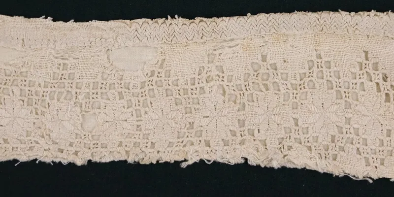 Embroidery sample on homespun bleached canvas, openwork. Geometric ornament.