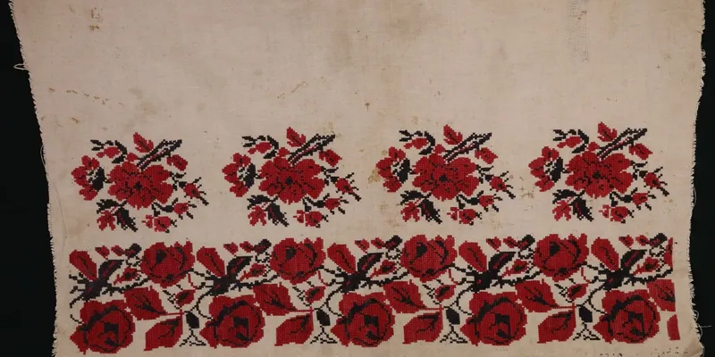 Rectangular canvas with embroidery—a fragment of a women's shirt sleeve. Floral ornament executed in red and black threads: a garland of roses with four large flowers with leaves and buds below.