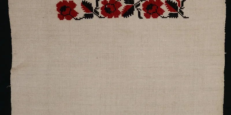 Women's shirt sleeve, cut as a rectangle across the full width of the canvas. Decorated with a stylized floral ornament embroidered in black and red threads. The decor consists of two horizontal ornamental bands: a wide band of roses (Rosa centifolia) with branches and leaves, and a narrower band of small four-petal flowers with branches and leaves ('cross-stitch').