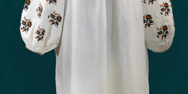 Shirt made of white factory-made linen canvas. Straight silhouette, body sewn from two panels, 'extended.' The sleeve has an insert sewn along the warp, straight, heavily gathered at the bottom into a band. The body and inserts are gathered at the neck. The neckline is square ('kare') with a slit in the center, finished with a narrow band. On the right side of the band is a loop buttonhole, and on the left is a white button. The neckline and sleeve bands are decorated with teeth. The insert, sleeves, neckline, and sleeve bands are embroidered with black and yellow threads in floral and geometric ornaments using the cross-stitch technique. The insert and sleeve have two parallel horizontal pattern stripes consisting of curled branches with elongated leaves and stylized flowers attached. The insert features a scattered pattern of leaves, and the sleeves have stylized poppies with buds and leaves. The neckline and sleeve bands are decorated with a wavy line of crosses. The hem is decorated with white openwork.