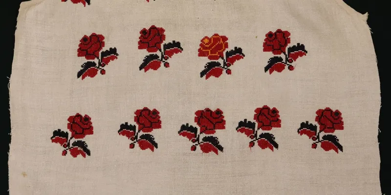 Irregularly shaped canvas with embroidery—a fragment of a women's shirt sleeve. Floral ornament executed in red, black, and yellow threads, consisting of roses arranged in three rows: five flowers in the first and third rows, four in the second.