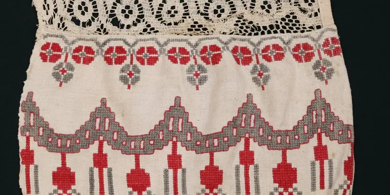 Rectangular canvas, a fragment of a rushnyk edge. Decorated with two bands of floral ornament in the form of stylized four-petal flowers, with tassels at the bottom. Lace is sewn between the ornamental bands, and handmade lace adorns the edge.
