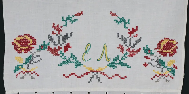Rushnyk made from white fabric. Decorated at the ends with embroidery of two compositions separated by machine-made openwork. The first composition features two branches joined by a ribbon, framing the embroidered initials 'EL.' To the left and right of it is a branch with a flower and leaves. The composition is embroidered in red, yellow, green, and gray threads. The second composition, closer to the edge, consists of a branch with buds and leaves, executed in red and gray threads. Factory lace with a wavy edge is sewn to the edge of the rushnyk. One longitudinal edge is hemmed with a narrow machine-stitched hem, the other is the selvage.
