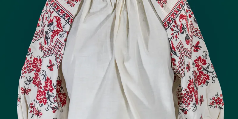 Shirt 'stanok' (to the waist) made from white factory fabric. The sleeve is long, with an insert. The shirt is embroidered with red and black threads. The sleeves are decorated with a floral ornament of lush grape clusters, and the inserts feature a geometric ornament. Provenance: The shirt was embroidered by Skabieieva-Bazanova Maria Volodymyrivna, who lived in Kharkiv.