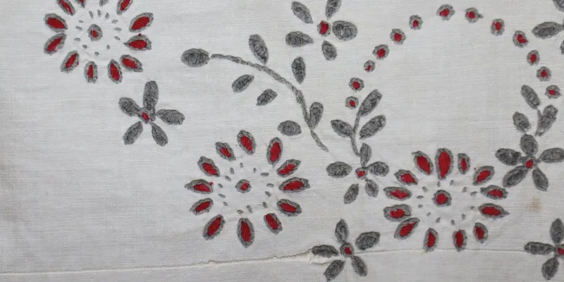 - Factory weaving, machine sewing, hand embroidery 'flat stitch,' stem stitch, openwork
