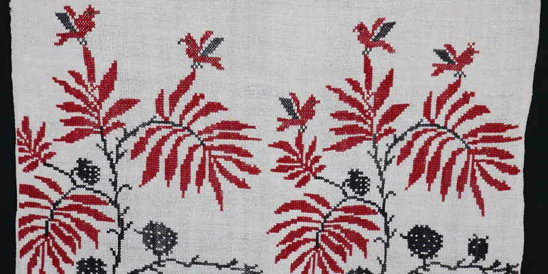 Rushnyk made from two fragments of white homespun canvas, embroidered in red and black threads. The floral, ornithomorphic, and geometric ornament is located at the edges. The ornament consists of two compositions: stylized chestnut branches with fruits and leaves, with three birds on each; below, pairs of swans with a floral-geometric ornament between them. Below the swans is a band with a geometric ornament and tassels. The ends of the rushnyk are decorated with handmade lace with a geometric ornament and a toothed edge. The rushnyk is hemmed with a hand stitch.