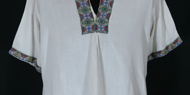 Men's short shirt made from white factory fabric with a plastron. The rectangular plastron extends to mid-chest. The sleeves are short and wide. The collar is narrow, stand-up. Fastener with four buttons. The collar, sleeves, and plastron are embroidered with a dense geometric ornament in red, green, yellow, blue, and light blue threads.