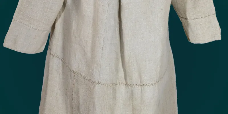 Shirt 'to the hem.' The bodice and hem are sewn from coarse grayish hemp canvas from six parts. The sleeve is one-piece, sewn along the warp, narrowed at the bottom, three-quarters length, with a gusset and a wide cuff (7.6 cm). The sleeve is attached to the bodice with a single overcast stitch. The bodice and upper part of the sleeves are densely gathered near the neckline using the 'sewing to the collar' technique. The neckline is oval, with a central slit (28.5 cm), finished with a cuff. The cuff is sewn with an overcast stitch. On the shoulder, a zigzag line is embroidered with black woolen thread using the cross-stitch technique. The hem is hemmed and decorated with a double 'prutyk' openwork. Above it, a horizontal stripe (2 cm wide) of geometric pattern (four squares and two slanted lines, rhythmically repeated) is made with bleached hemp thread using the techniques of cutting, satin stitch, and openwork. The connecting seams of the hem (at a height of 6.5 cm) are decorated with a 'worm' stitch made with red and black woolen thread.