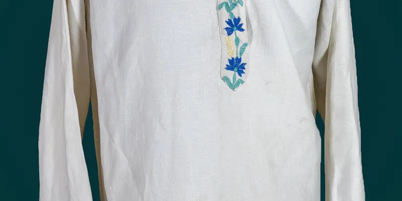 Men's 'kosovorotka' shirt made from bleached homespun canvas with a placket to mid-chest. Stand-up collar, fastener with five buttons, and slit loops. The sleeves are long and wide. The collar, sleeves, placket, and hem of the shirt are embroidered with a floral ornament of cornflowers, spikes, and leaves in blue, green, and yellow threads.
