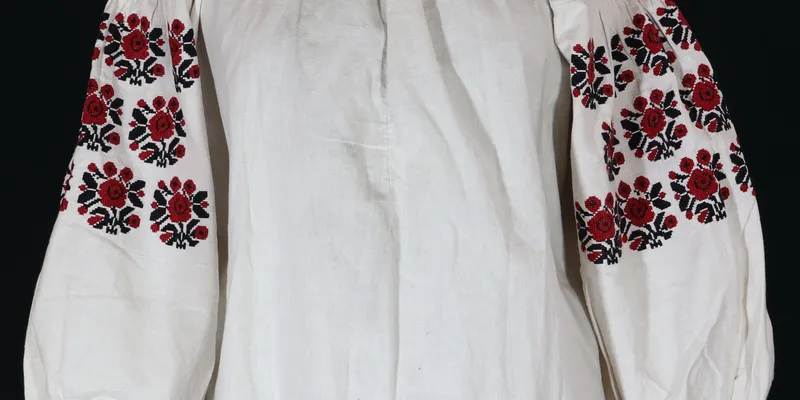 Women's shirt 'stanok,' made from white factory cotton fabric, embroidered with red and black threads. Straight silhouette. The sleeve has an insert sewn along the warp, long, wide, straight, with a gusset. The sleeve and insert are joined with double hemstitch and three rows of 'puffs.' The sleeve bottom is gathered into small folds and trimmed with a strip using double hemstitch. The neckline is round, gathered with pleats using the 'sewing to the collar' technique, and trimmed with a strip using double hemstitch, with elongated ends for tying. The plastron has a long slit. The shirt is decorated on the sleeves and inserts with a stylized floral ornament featuring multi-petal flowers with leaves and buds. The neckline trim is adorned with a zigzag line. Provenance: The shirt was sewn and embroidered by Karpenko Hanna Hryhorivna, a resident of Kharkiv.
