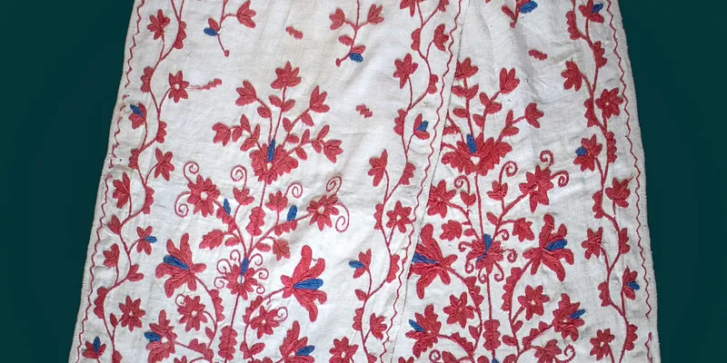 Rushnyk decorated with red and blue embroidery. The central composition on both ends is a mythical tree growing in a vase. Around the tree and across the entire field of the rushnyk, there is a scattered pattern of floral branches. Below the tree and along the perimeter, the rushnyk is bordered with a wavy floral branch and a zigzag line. The rushnyk is hemmed with an overcast stitch.