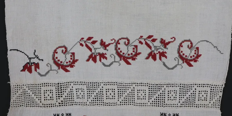Rushnyk made from homespun bleached canvas, embroidered with red and black threads. The ornament is floral and ornithomorphic. At the ends of the rushnyk, there is a wavy branch, below which are two trees, each flanked by two birds. Between the embroidered ornaments, there is a band of openwork with a geometric square pattern. The edges of the rushnyk are decorated with wide openwork featuring a viburnum branch and a wavy edge.