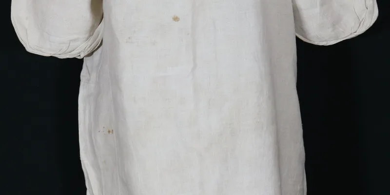 Shirt made of bleached linen homemade canvas. Straight silhouette, bodice sewn from three panels, 'dodіlna.' The sleeve with an inset, sewn along the weft, straight, with a gusset, gathered with 'puffy' gathers, gathered at the bottom, with a cuff. The bodice and insets are gathered near the neckline. The neckline is oval, with a central slit and two slit loops, finished with a narrow cuff. The insets and sleeves are embroidered with black threads, with a slight inclusion of red threads, using the cross-stitch technique in a floral pattern. The inset and upper part of the sleeve feature a horizontal stripe of a pattern with round flowers and elongated leaflets attached to curved branches. The sleeves have a scattering of small bouquets of round flowers. The hem is hemmed with 'prutyk' openwork. Above it, a thin horizontal stripe (0.8 cm wide) of stylized floral pattern, made with the cross-stitch and stem stitch techniques in red and black woolen thread.
