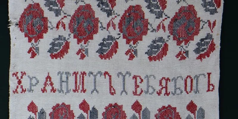 Rushnyk (fragment) made from homespun bleached canvas, embroidered with red and black threads. The ornament is floral, ornithomorphic, and zoomorphic. The tiered composition includes: closer to the center, three pheasants; two rose garlands with the inscription 'Хранит тебя Бог' between them; closer to the edges, images of deer. Lace with a floral ornament is sewn to the edges.