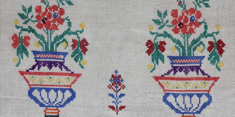 Rushnyk made from homespun bleached canvas, embroidered with black, red, blue, green, pink, purple, and yellow threads. The ornament is floral and geometric. The tiered composition includes: three bands of geometric ornament; two vases with lush bouquets; a grapevine with clusters and leaves. The edges are hemmed with openwork.