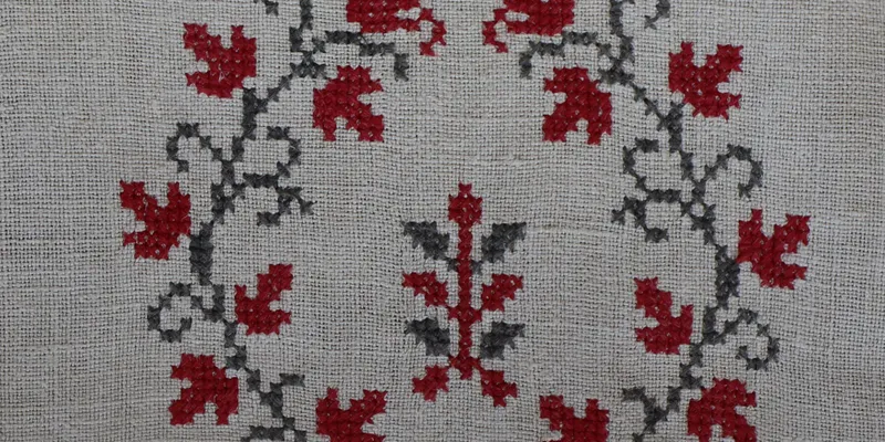 Rushnyk made from homespun bleached linen canvas, embroidered with red and black threads. The ornament is floral in the form of floral branches.