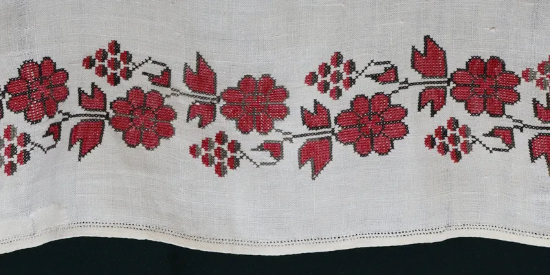 Rushnyk made from homespun bleached canvas, embroidered with red and black threads. The ornament is floral in the form of a grapevine with flowers, clusters, and leaves. The edges are hemmed with openwork.