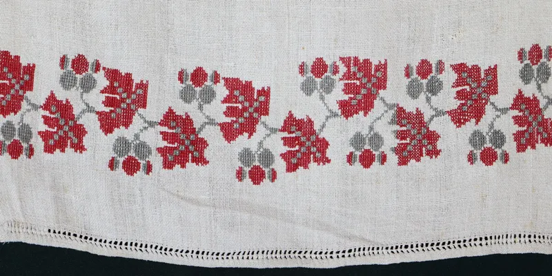 Rushnyk made from homespun bleached canvas, embroidered with red and gray threads. The ornament is floral and geometric. The tiered composition includes: a branch with eight-petal flowers and leaves; wide openwork with a geometric ornament; a grapevine with clusters and leaves. The edges are decorated with openwork. Provenance: Woven and embroidered by Halyna Vasylivna Kolomiets.