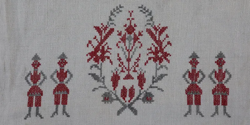 Rushnyk made from homespun bleached canvas, embroidered with red and black threads. The ornament is floral, geometric, and anthropomorphic. It is decorated at the ends of the rushnyk. In the center, there is a floral crown, flanked by a pair of men on both sides. At the bottom, there is a zigzag floral branch. The ends are hemmed with openwork. Lace is sewn to the bottom. Provenance: Used in the family of R.V. Zakutnyi, a resident of the village of Dmytrivka, Bohodukhiv District.