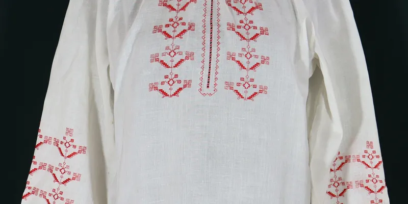 Shirt made from white fabric, raglan long sleeves. The neckline and sleeve bottoms are gathered into ruffles. The embroidery is in red threads with a geometric ornament on the sleeves and cuffs. Provenance: Produced by the 'Ukraine' artistic production association. The design was created by Alla Nikiforivna Korzun and Vira Semenivna Chala, executed by Nina Tykhonivna Gubska.