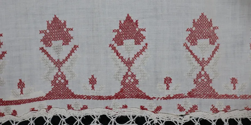 Rushnyk made from white factory canvas, embroidered with red, white, green, gray, and pink threads. The ornament is anthropomorphic and floral-geometric. The tiered composition is decorated with lace at the edges.