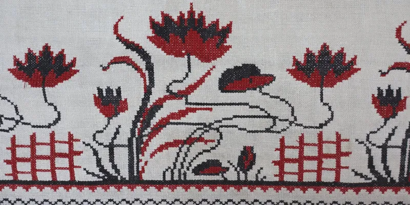 Valance in the form of a rectangular canvas, hemmed on three sides (one horizontal side with a hem and openwork). Handmade lace with a geometric ornament is sewn to the bottom edge. The valance is embroidered with red and black threads, with pink threads used instead of red on the tassels on one side. The ornament is floral and geometric: the lower row features tassels, and the upper row has a wide band of stylized flowers arranged in clusters above stylized fences. Provenance: Around 1900–1910, Kharytyna Stepanivna Harkava sewed and embroidered this valance. It was later preserved in the family of her son, historian and local historian P.A. Pleskach, co-author of an article about Dvorichna in 'History of Cities and Villages of the Ukrainian SSR. Kharkiv Oblast' (pp. 405–414). It was eventually passed down to the family of his granddaughter, N.P. Biryukova. Kharytyna Stepanivna Harkava, a resident of Dvorichna (~1866–~1975), began working as a seamstress at age 10. She sewed for sale until age 90 and embroidered and crocheted for herself. She had students whom she taught sewing, embroidery, and crocheting.