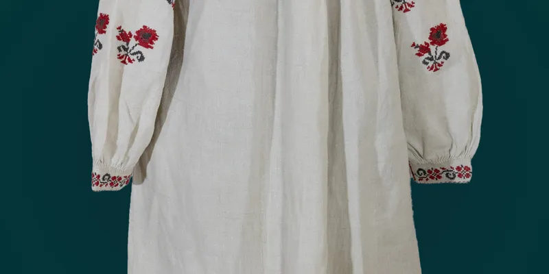 Shirt made of bleached hemp canvas. Straight silhouette, bodice sewn from three panels, 'dodіlna.' The sleeve is one-piece, sewn along the warp, straight, with a gusset, gathered at the bottom, on a cuff. The bodice and sleeves are gathered near the neck. The neckline is oval, with a deep central slit, finished with a narrow cuff. The cuff has two slit loops for a tie. The tie is made of red garus, crocheted. The sleeves and hem are decorated with a geometric-floral pattern in red and black woolen thread using the cross-stitch technique. On the shoulder, a horizontal stripe of a pattern with flowers and buds, framed on both sides by a pattern of small stylized flowers and leaflets. The sleeves have a scattering of stylized poppy stems with buds placed in small vases. The cuffs are decorated with scalloped teeth and a floral pattern. The hem is adorned with 'prutyk' openwork. Above it, a geometric pattern consists of swirls connected to each other. The neckline is decorated with a thin red broken line made with the backstitch technique. The connecting seams in the lower part of the sleeves and bodice are decorated with a 'worm' stitch in red and black woolen thread. Legend: Olha Hryhorivna Protsenko — creator of the item.