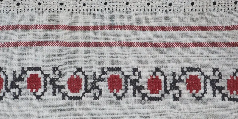 Rushnyk made from homespun bleached canvas with woven red stripes, embroidered with red and black threads. The ornament is floral and geometric. The tiered composition includes: three bands with a wavy branch and bud, alternating with bands of openwork with a geometric ornament. At the bottom, the rushnyk is decorated with a band of stylized fringe. The rushnyk is hemmed with openwork. Provenance: Belonged to the pre-war collection of the Museum of Sloboda Ukraine named after H.S. Skovoroda.