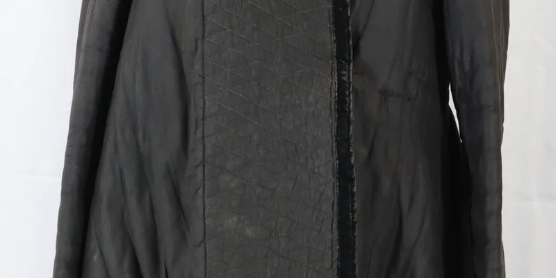 Skirt made from black fabric, with a detachable back at the waist, featuring three 'whiskers.' The waistline is decorated with ribbon in black, pink, and blue colors. The sleeves are decorated with plush. The hem and right panel are adorned with decorative stitching. The skirt has a lining with a thin layer of batting. Provenance: Belonged to Fekla Danylivna Nikolaenko, a peasant from the village of Pryshyb, Balakliya District.