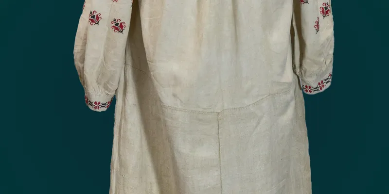 Shirt 'to the hem' made of hemp canvas (bodice from finer, hem from coarser canvas), sewn from six parts. Straight silhouette, the sleeve is one-piece, sewn along the warp, straight, with a gusset, gathered at the bottom, on a cuff. The bodice and upper part of the sleeves are densely gathered near the neckline. The neckline is oval, with a central slit, finished with a narrow cuff. The cuffs are decorated with scalloped buttonhole loops. The shirt is embroidered with red and black threads in a floral pattern using the cross-stitch technique. On the shoulder, a narrow horizontal stripe of a pattern consists of a straight line (stem) with eight-petaled flowers and branches with small leaflets attached. Further down the sleeve, a scattering of stylized tulips with elongated stamens. The cuffs are adorned with a narrow floral pattern. The hem is decorated with white openwork with overlay, featuring a pattern of eight-petaled flowers and swastika signs. The connecting seams in the lower part of the hem are hemstitched with a 'worm' stitch (red threads).