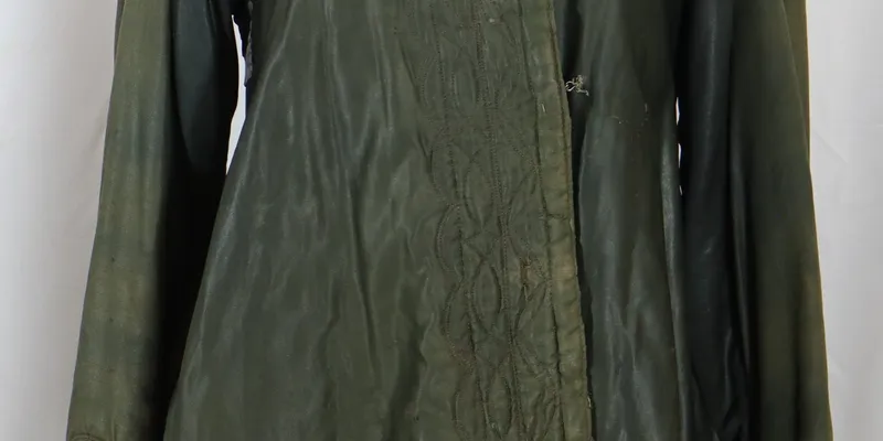 Yupka made of black fabric, with a back cut at the waist into 5 'whiskers.' Sleeves, collar, hem, and front are stitched with a wide ornament and decorated with velvet. The hem and right front panel are adorned with decorative stitching. The yupka is lined with beige calico.