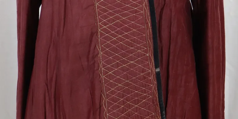 Yupka made of cherry-colored fabric, with a back cut at the waist with 'whiskers.' The waistline is accented with a strip of fabric and decorated with buttons. Sleeves are decorated with velvet, ribbons, and figured stitching. The hem is adorned with decorative stitching. The collar and right front panel are decorated with black velvet. The yupka is lined and has a layer of batting.
