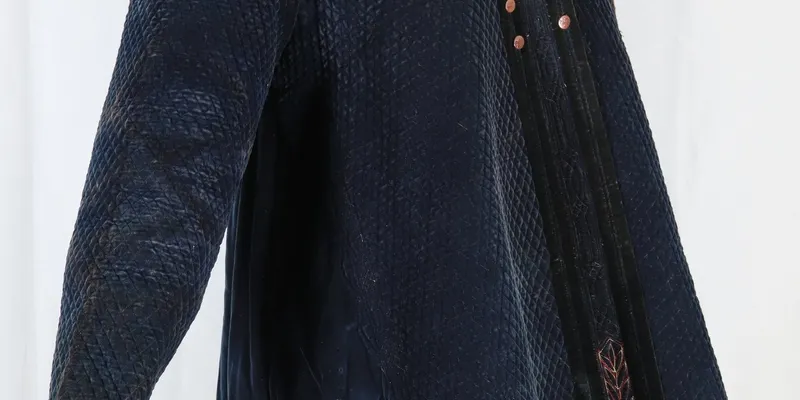 Yupka made of blue velvet fabric, with a back cut at the waist with 8 'whiskers.' Fastens with a hook. The front, sleeves, and upper back are stitched with a diamond-shaped ornament. The collar and right front panel feature machine embroidery in yellow and red threads. The edges of the right front panel, sleeves, and collar are trimmed with velvet. The upper part of the right front panel is decorated with buttons. The yupka is lined with canvas.
