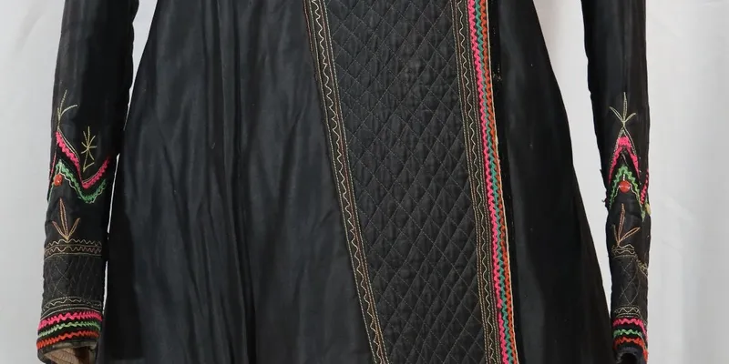 Yupka made of black fabric, with a back cut at the waist with three 'whiskers.' The waistline is accented with a strip of velvet fabric, pink braid, and decorated with 9 buttons. The hem, right front panel, and sleeve bottoms are stitched with a diamond-shaped ornament. The right front panel and sleeve bottoms are decorated with velvet, red, green, and pink braid, and decorative stitching. The right front panel is adorned with buttons, two rows of 7 each. The yupka is lined with beige fabric and has a thin layer of batting.
