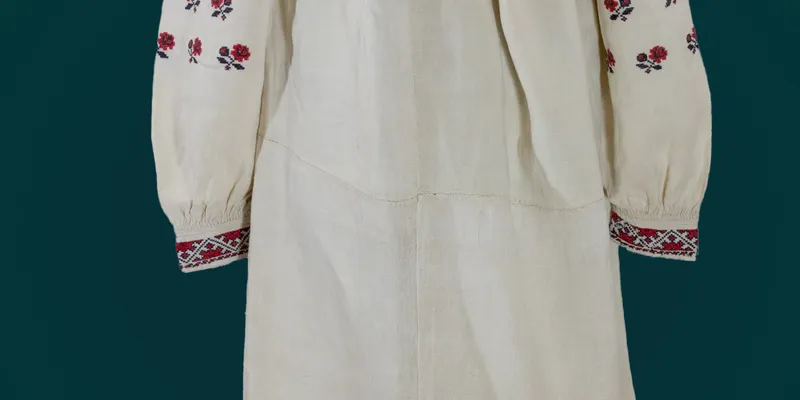 Shirt 'to the hem' made of bleached hemp canvas (bodice from fine canvas, hem from coarse canvas). The sleeve is one-piece, sewn along the warp, straight, with a gusset, gathered at the bottom, on a cuff. The bodice and upper part of the sleeves are gathered near the neckline. The neckline is oval, with a central slit, finished with a narrow cuff. The cuff has two slit loops for a ribbon. The chest is hemmed with openwork (divided prutyk). The shirt is embroidered with red and black woolen thread in a floral pattern using the cross-stitch technique. On the shoulder, a narrow horizontal stripe of a pattern with不受: The rose pattern is framed on both sides by thin outlines of straight lines and leaflets. Further down the sleeve, a scattering of small roses with leaflets and buds. The cuffs are decorated with a horizontal stripe of a geometric pattern composed of half-diamonds with extensions. The edges of the cuffs are adorned with scalloped teeth. The hem is decorated with openwork with overlay and prutyk through a grid. The openwork is 5 cm wide, with a floral pattern made with white hemp threads. The connecting seams in the lower part of the bodice are decorated with a 'worm' stitch in red woolen thread. Legend: Yevdokia Zakharivna Ponomarenko — creator of the item.