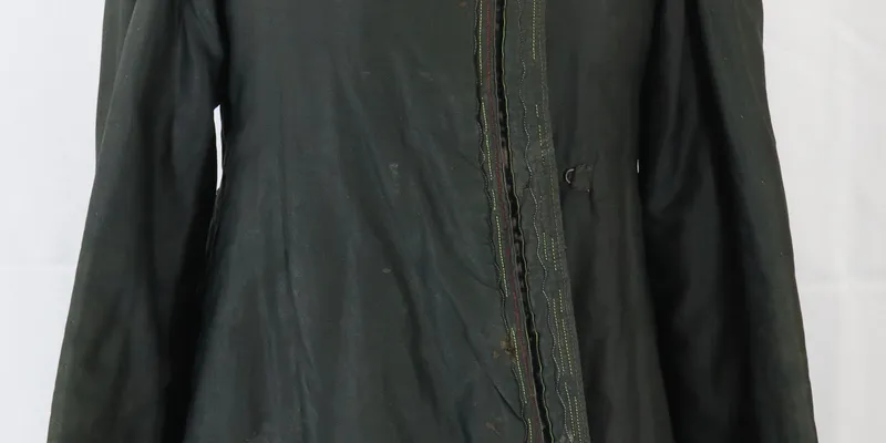 Yupka made of green fabric. Fastens with 3 hooks. The back is fitted and cut at the waist with 5 'whiskers.' The waistline is accented with 5 metal buttons. The right front panel, sleeve bottoms, and hem are decorated with velvet and machine stitching in red and yellow. The yupka is lined with brown satin and a thin layer of batting.