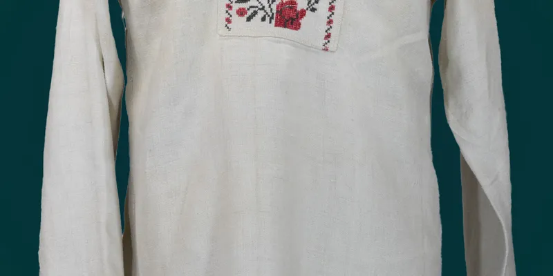 Men's kosovorotka shirt made of bleached canvas. The silhouette widens downward with triangular inserts from the armpits. Set-in sleeves, stand-up collar, fastened with 3 buttons. Decorated with red and black embroidery on the collar and placket. The ornament is floral, featuring rose branches.