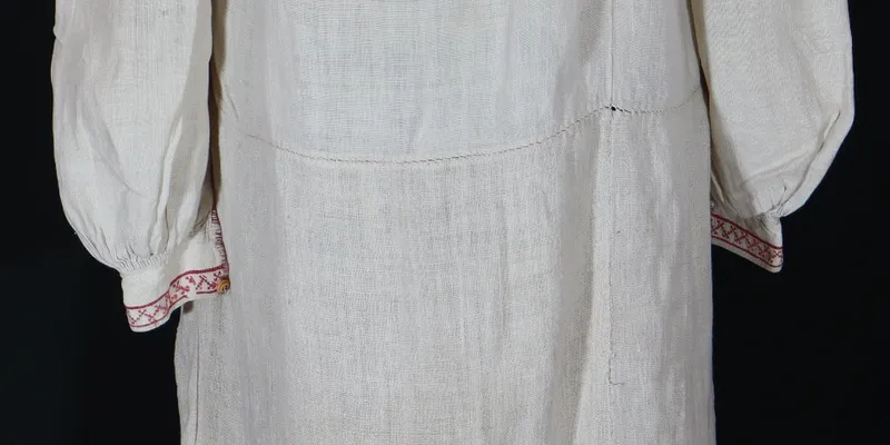 Shirt 'to the hem.' Straight silhouette, sewn from six parts. The bodice is made of finer hemp canvas, the hem from coarser canvas. The sleeve is one-piece, straight, wide (with an auxiliary panel), with a gusset, gathered at the bottom, on a cuff. The bodice and sleeves are densely gathered near the neckline into small folds using the 'sewing to the collar' technique. The neckline is oval, with a central slit on the front, finished with a narrow cuff sewn with a triple overcast stitch. At the ends of the cuff, there are two slit loops for a ribbon. The shirt is embroidered with a geometric pattern in 'white on white' with bleached linen threads using the techniques of cutting, satin stitch, dovbanka, chain stitch, and cross-stitch. The upper part of the sleeve features a horizontal stripe of a pattern composed of 'keys,' half-diamonds, and geometric flowers and half-flowers. The sleeve field has a scattering of diamonds with an inscribed square. The cuff is adorned with a 'krulyka' (cross-stitch technique), embroidered with red woolen thread. The hem is hemmed with 'prutyk,' decorated with openwork, framed on both sides by a 'krulyka' (zigzag line) made with the surface stitching technique in red woolen thread. Legend: According to the records in the inventory book TK-1, the shirt was received from the Museum of Sloboda Ukraine named after H.S. Skovoroda.