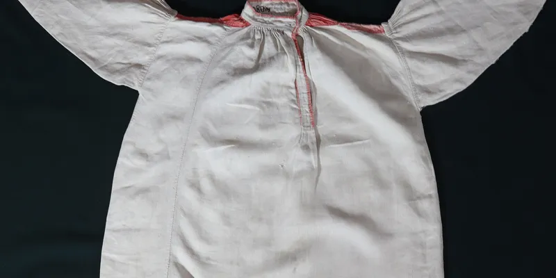 Children's kosovorotka shirt made of bleached canvas. Straight silhouette with an insert on one side from the neckline to the hem. The sleeve is gathered with puffs, stand-up collar, fastened with a button. Decorated with strips of red calico on the collar, placket, and shoulders in an arrow shape.