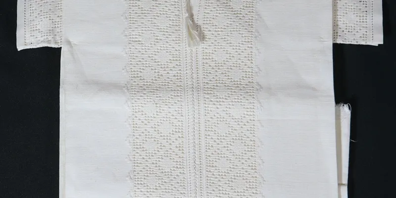 Men's shirt (coupon) 'chumachka.' Made of white linen canvas. Sleeves and placket embroidered with white threads. The placket has two vertical strips of openwork mesh. Geometric ornament.